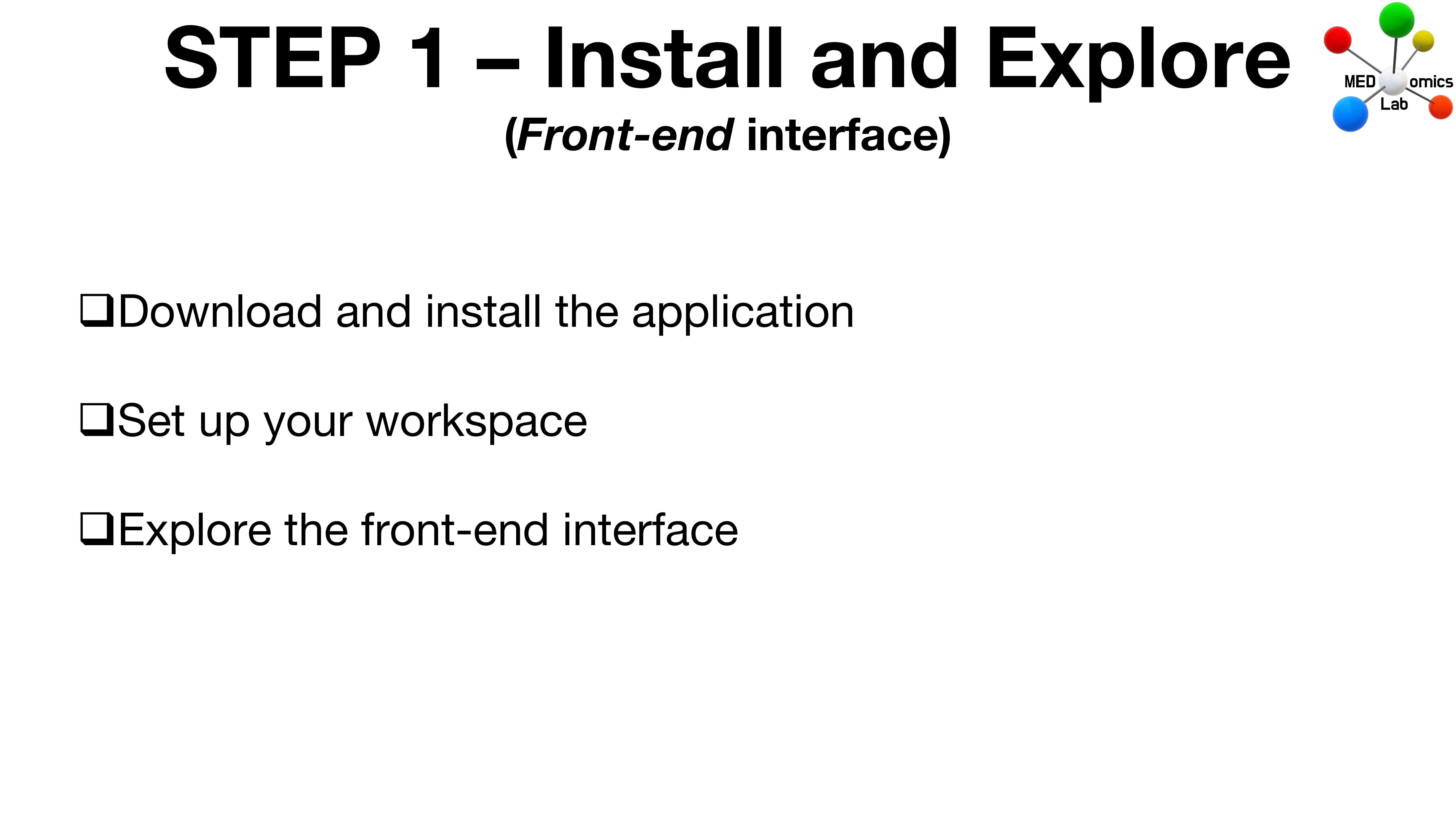 <figure><img src="https://content.gitbook.com/content/7cVTUTkb3KodRR4EGOZH/blobs/IjZmKo3qqDZG3hZZphV4/MEDomicsLab-TestingPhase-09.png" alt=""><figcaption><p>Step 1 - Install and Explore</p></figcaption></figure>