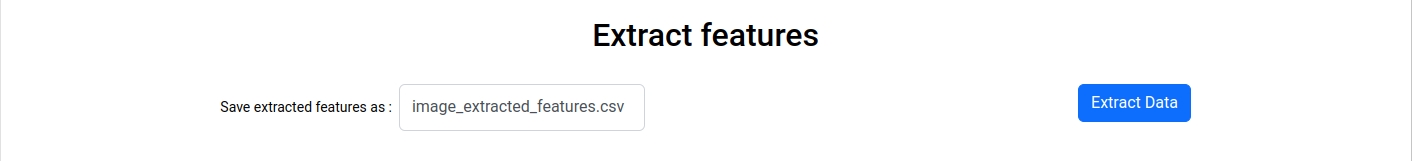 In this section, you can specify the filename under which you want to save your generated embeddings. The filename must be followed by the .csv extension, composed only of letters, numbers, and/or the '_' character, and cannot be empty. The default filename is 'image_extracted_features.csv.' The file will be saved under DATA/extracted_features.