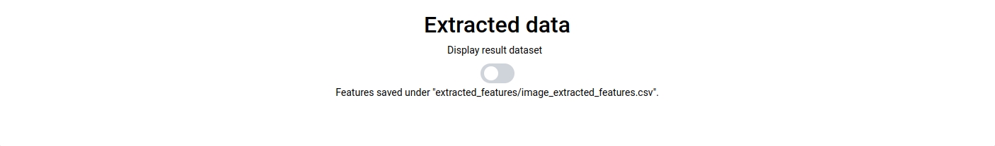 Once the extraction process is complete (which may take a few minutes, but you can monitor the progress on the output tab), a message will appear at the bottom of the page indicating where the features have been saved. You can review your results in the 'Extracted data' section by toggling on the switch. Alternatively, you can open your generated CSV file in your workspace.
