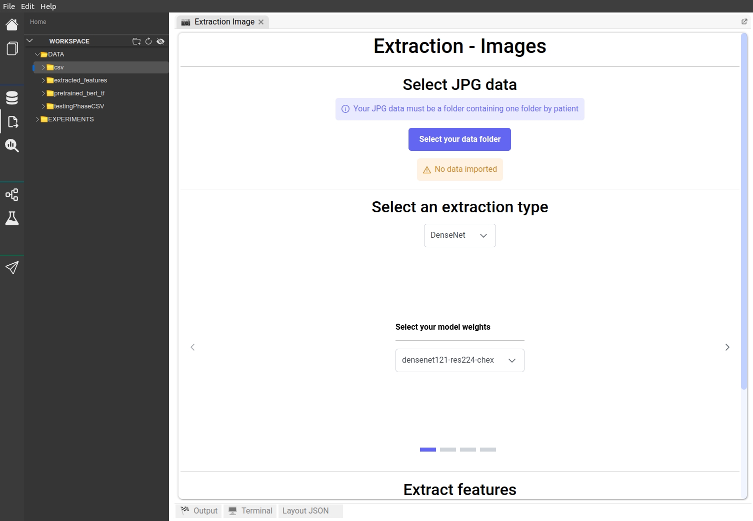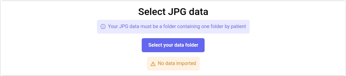 The first step on this page is to select your input, which is a folder containing folders containing JPG images. The folders contained in the main folder must correspond to patients (one folder by patient). All the JPG files must be at the same folder depth level. Once your data will be imported, the warning "No data imported" will be replaced with a success message "Data successfully imported".
