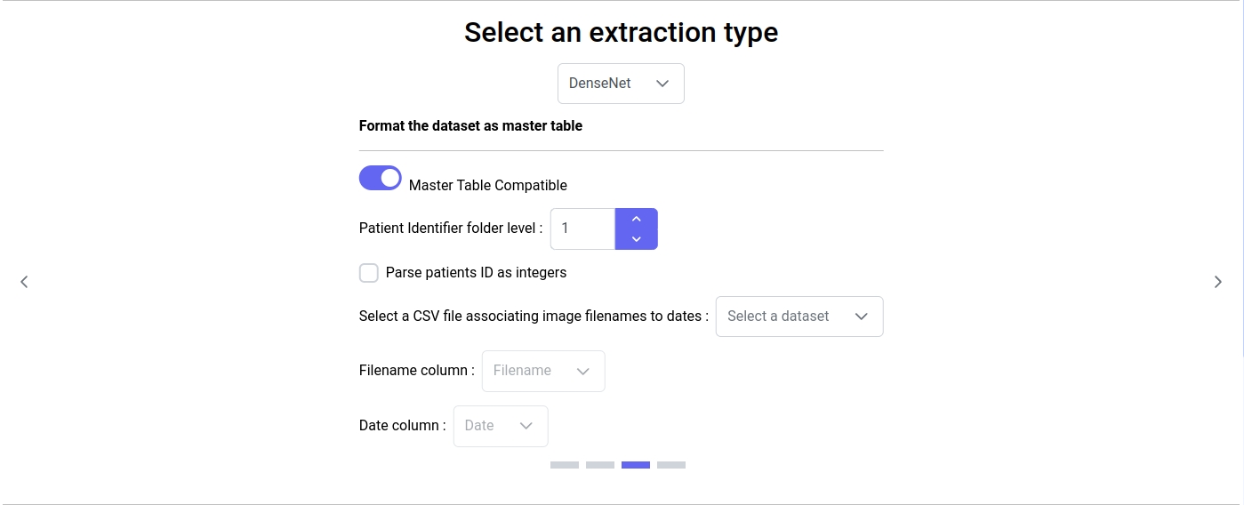 For the images extraction, turning this option on will require a CSV file that associates the image filenames (including the .jpg extension) to a datetime. Also, you have to indicate which folder level corresponds to the patients identifiers and there is a checkbox that allows you to convert the patients identifiers folder name into integers (for example if a folder name is 'p123', it will be converted into '123' in the generated embeddings table). This option is useful if you want to compare the patients image data to other data types where the patients identifiers are numbers.