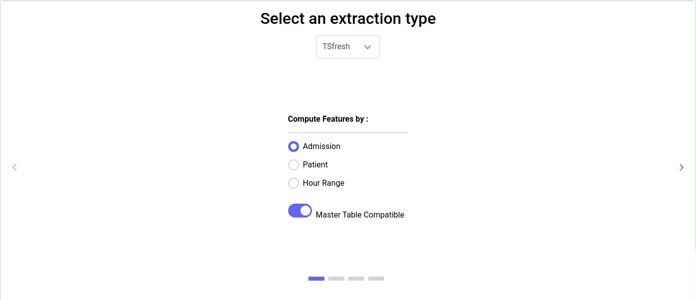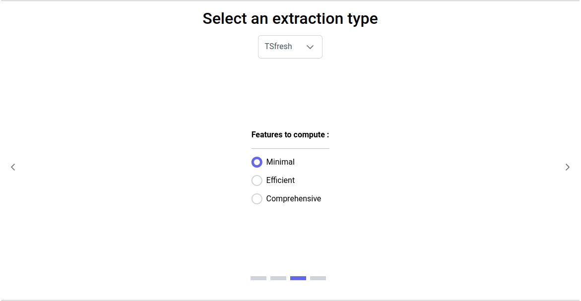 Regardless of the options selected earlier, you can choose between three methods of feature computation: Minimal, Efficient, and Comprehensive. These options represent predefined sets of features provided by the TSfresh package: https://tsfresh.readthedocs.io/en/latest/text/feature_extraction_settings.html. Specifically, the three options are defined as follows: