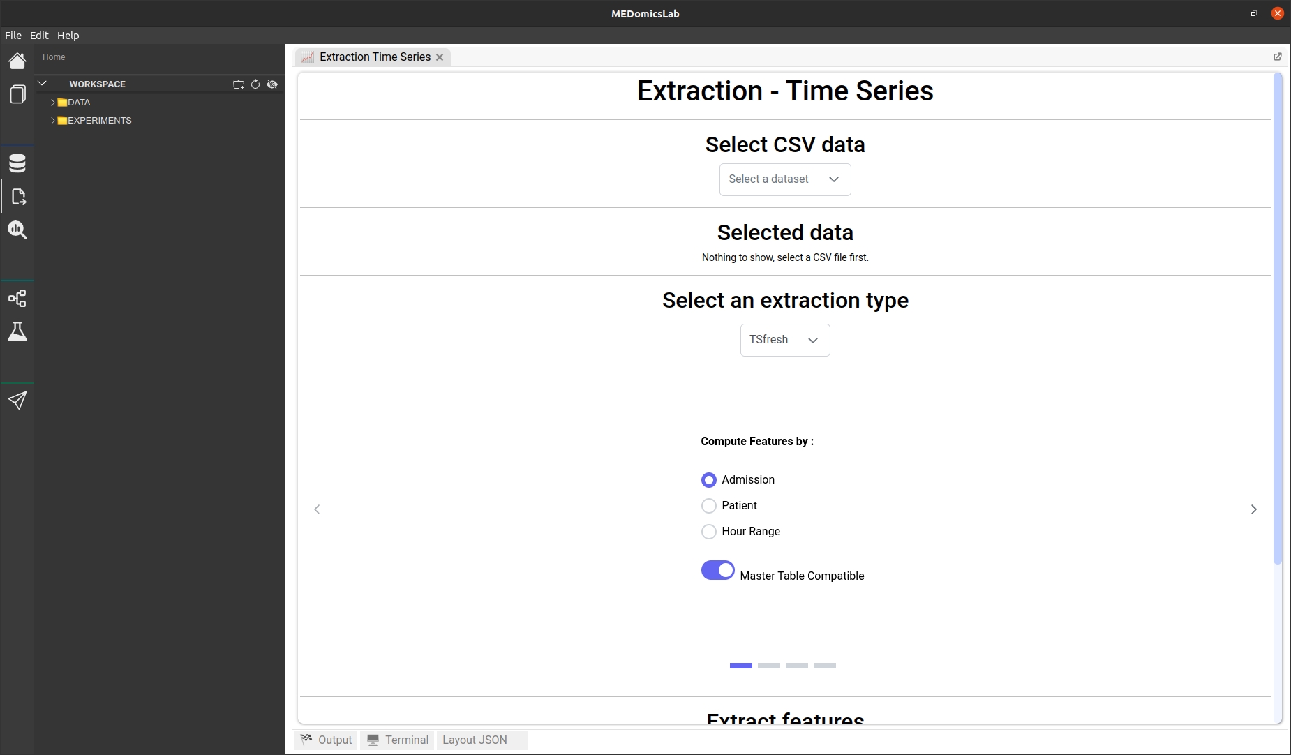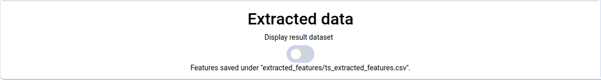 Once the extraction process is complete (which may take a few minutes, but you can monitor the progress on the output tab), a message will appear at the bottom of the page indicating where the features have been saved. You can review your results in the 'Extracted data' section by toggling on the switch. Alternatively, you can open your generated CSV file in your workspace.