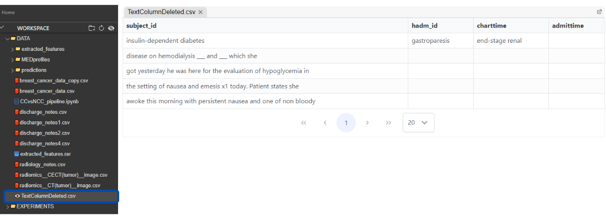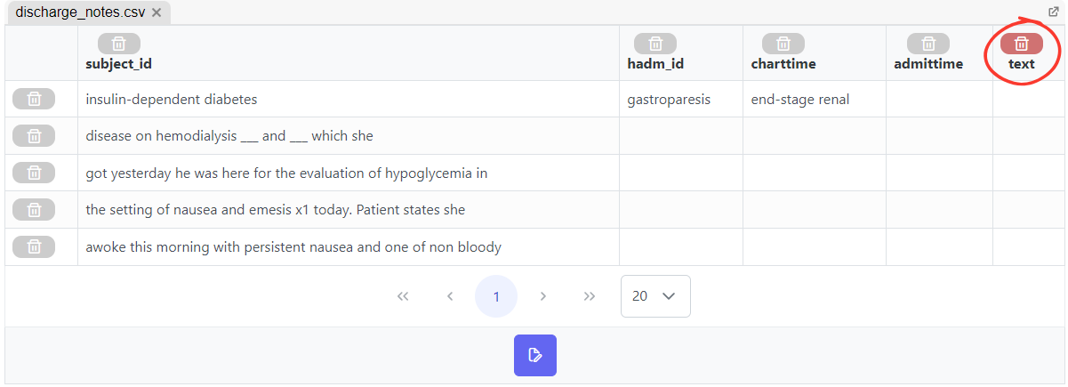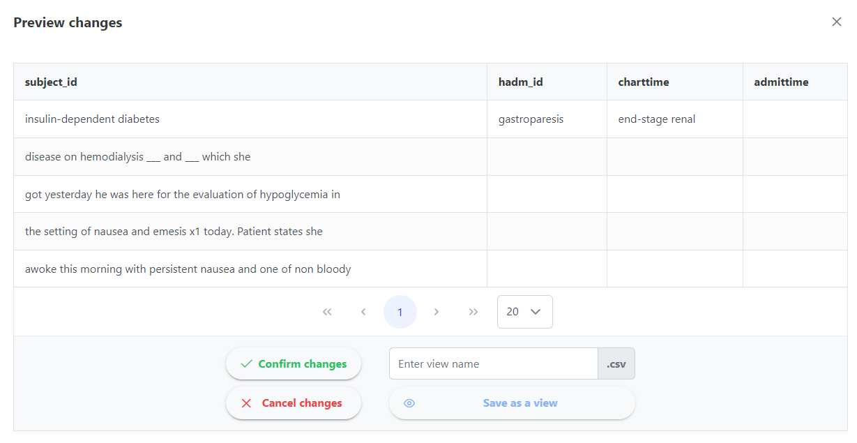 une fois que le bouton supprimer "*Text*" colonne est pressé, un panneau d'aperçu apparaît, offrant des options pour confirmer, annuler ou enregistrer les modifications en tant que vue. Sélectionner "*confirmer les modifications*" appliquera les changements directement au jeu de données original (c.-à-d. supprimera la "*Text*" colonne) :