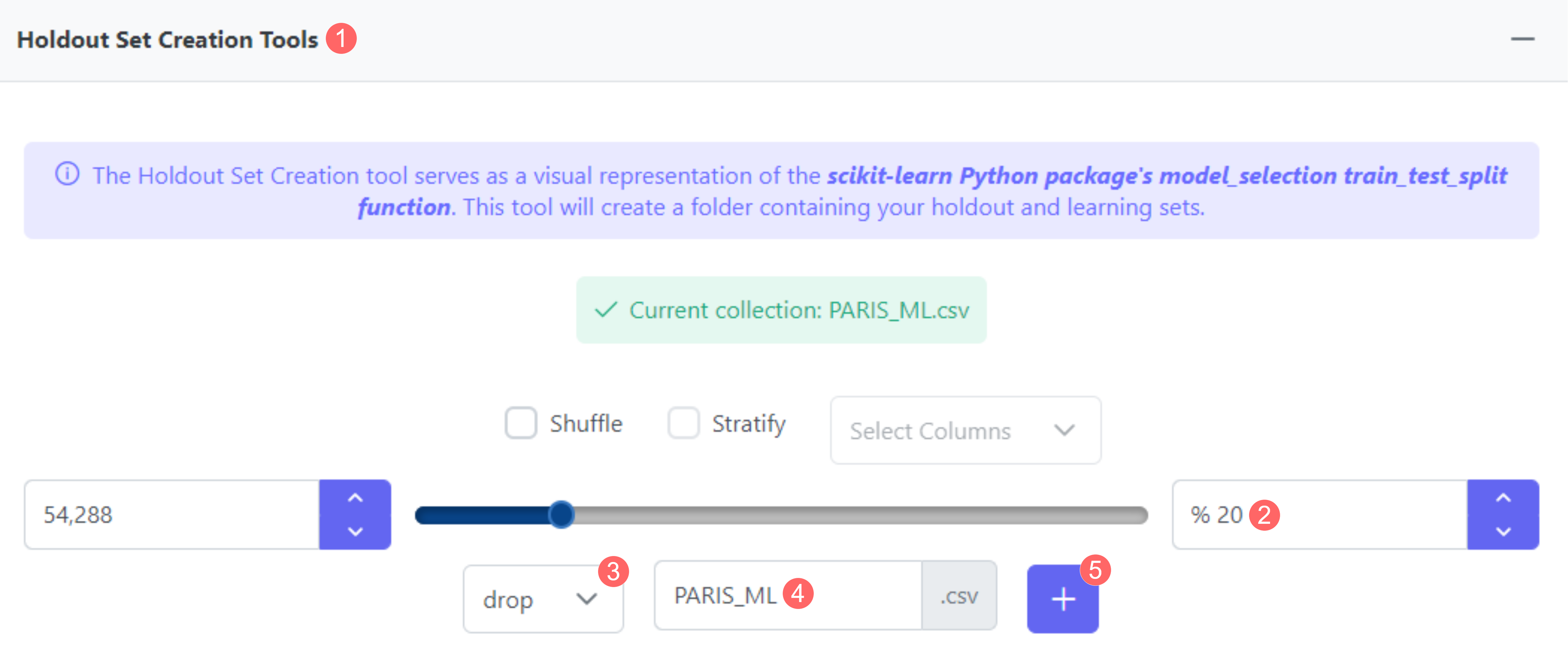 Après avoir nettoyé notre ensemble de données, l’étape finale consiste à le diviser en un ensemble d’apprentissage et un ensemble de validation (holdout). Pour cette tâche, nous utiliserons les *Outils de création d’ensemble de validation (holdout)*. Après avoir sélectionné notre CSV final (`PARIS_FINAL.csv`), conservez le pourcentage de division à 20 %, choisissez « drop » comme méthode de nettoyage des cellules vides (n’hésitez pas à tester d’autres options) et `PARIS_ML` comme nouveau nom de CSV. Cliquez ensuite sur l’icône plus. Cela créera deux nouveaux jeux de données CSV : `Holdout_PARIS_ML.csv` et `Learning_PARIS_ML.csv`. Ces étapes sont illustrées dans la figure ci-dessous :