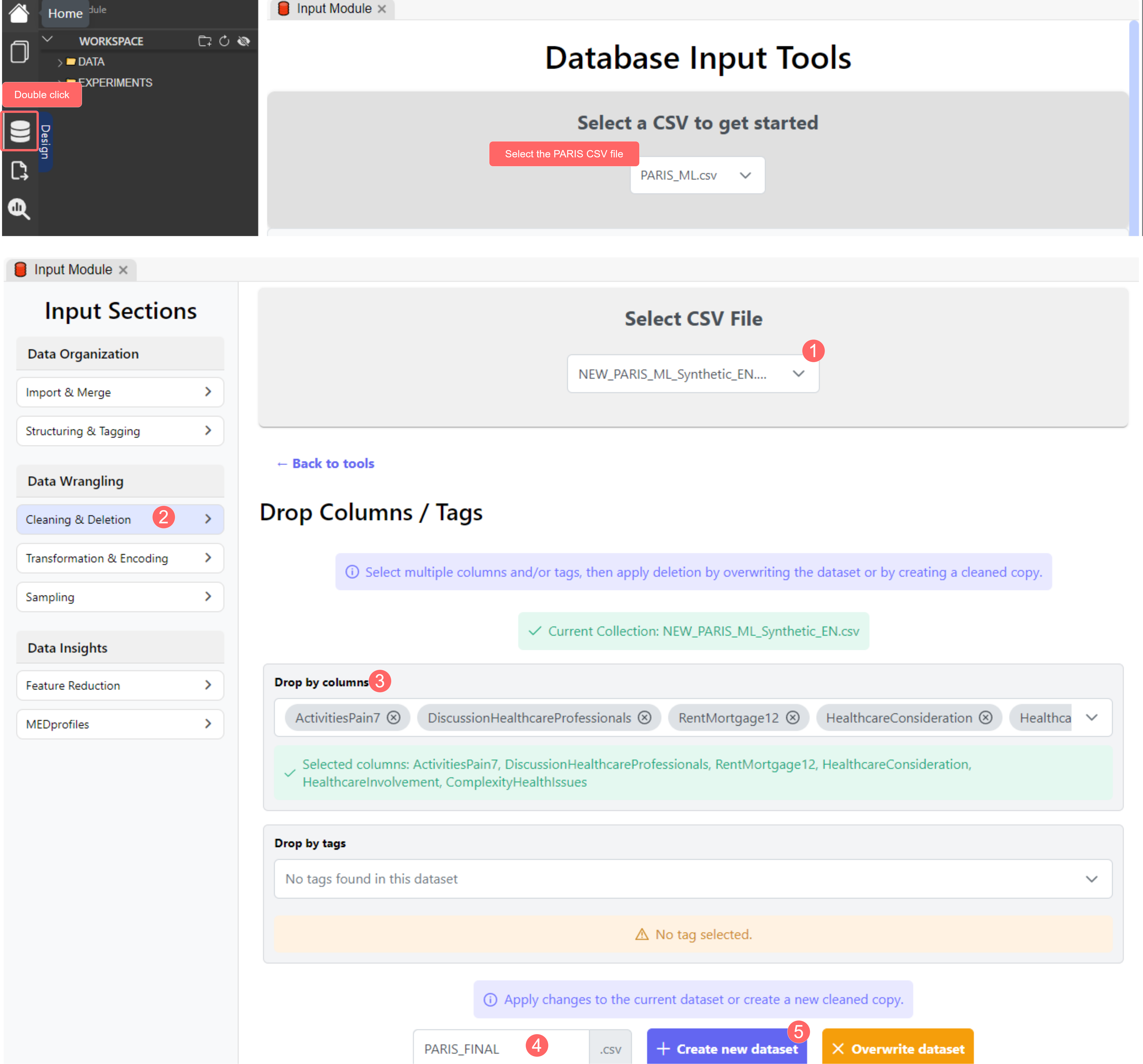 Le [Module d’entrée](https://medomicslab.gitbook.io/medomics-docs/v1-fr/tutorials/design/input-module) fournit plusieurs outils clés de traitement des données nécessaires pour accomplir diverses tâches au sein de la plateforme MEDomics. Dans cette preuve de concept (PoC), nous l’utiliserons pour deux tâches principales : la suppression des variables associées et la création d’un ensemble de validation (holdout).
