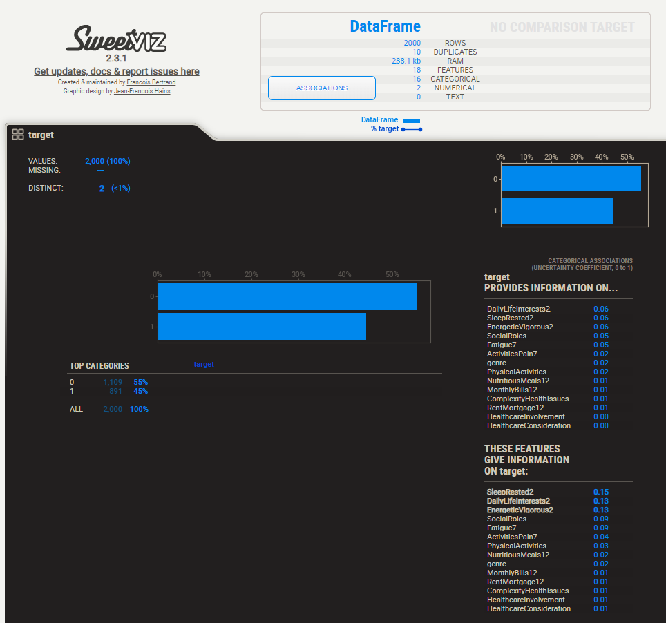 À l’ouverture du rapport HTML, vous remarquerez un récapitulatif de toutes les caractéristiques présentes dans le fichier du jeu de données, en commençant par la valeur cible et en terminant par la dernière colonne. La section Target illustre la relation entre la variable cible et les autres caractéristiques. Elle quantifie la manière dont la cible fournit des informations aux autres caractéristiques et vice versa. Dans notre PoC (voir le rapport ci-dessous), nous pouvons voir que la variable cible fournit des informations pour les caractéristiques suivantes :